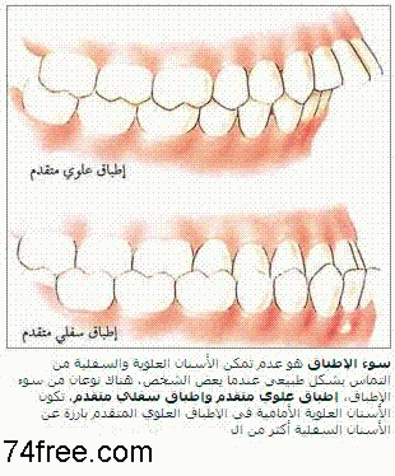 سوء الإطباق. هو عدم تمكن الأسنان في الفكين العلوي والسفلي من التطابق بشكل صحيح. فعندما يتطابق الفكان بعضهما فوق بعض، يجب في الحالات الطبيعية أن تتخطى الأسنان الأمامية العلوية مثيلاتها السفلية قليلاً. وهناك ثلاثة أنواع رئيسية لسوء الإطباق: إطباق الفك العلوي المتقدم وإطباق الفك السفلي المتقدم وازدحام الأسنان. وفي حالة إطباق الفك العلوي المتقدم تبرز الأسنان العلوية الأمامية. ويطلق على هذا الخلل عادة أسنان الوعل. أما في حالة إطباق الفك السفلي المتقدم، فإن الأسنان تبرز أمام مثيلاتها العلوية. ويكون عند العديد من الأشخاص إطباق طبيعي إلا أن أسنانهم تكون مزدحمة. وازدحام الأسنان هو أكثر أنواع سوء الإطباق انتشارًا.